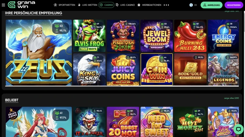 Unsere Lobby umfasst rund 12.000 Spiele, mit Filtern, die Ihnen beim Sortieren nach Provider, Feature oder Volatilität helfen. Im Granawin Casino zeigt jedes Spiel sein RTP im Infobereich an, und unser durchschnittliches Plattform-RTP liegt bei 95%. Wenn Sie schnelle Empfehlungen bevorzugen: Das sind beliebte Titel, mit denen viele Spieler starten, zusammen mit dem jeweiligen Studio.