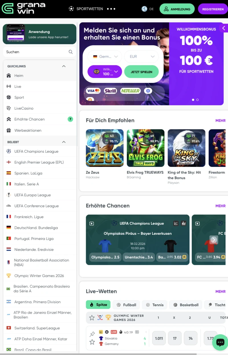 Wenn du bereits ein Konto hast, gehe direkt zum Granawin Login, und du siehst dein Guthaben sofort. Wenn du ein Willkommensangebot auswählst, werden die wichtigsten Punkte während der Anmeldung angezeigt, einschließlich der Umsatzbedingungen. Dein gewählter Granawin Bonus hängt von deiner ersten Einzahlungsart und dem Bereich ab, den du am häufigsten nutzen möchtest.